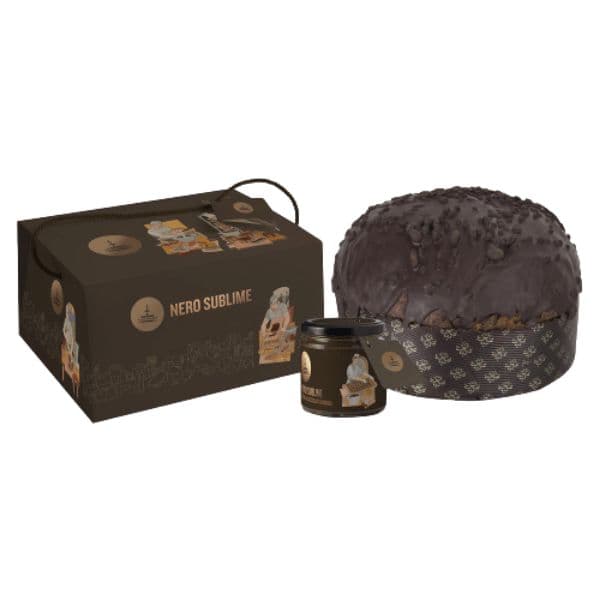 Panettone con gocce di cioccolato di Sicilia ricoperto da confettura di fragoline di bosco e cioccolato fondente, con crema al cioccolato di Sicilia da spalmare, confezionato a mano. La confezione contiene: il panettone, un vasetto di crema al cioccolato di Sicilia e uno spalmino.